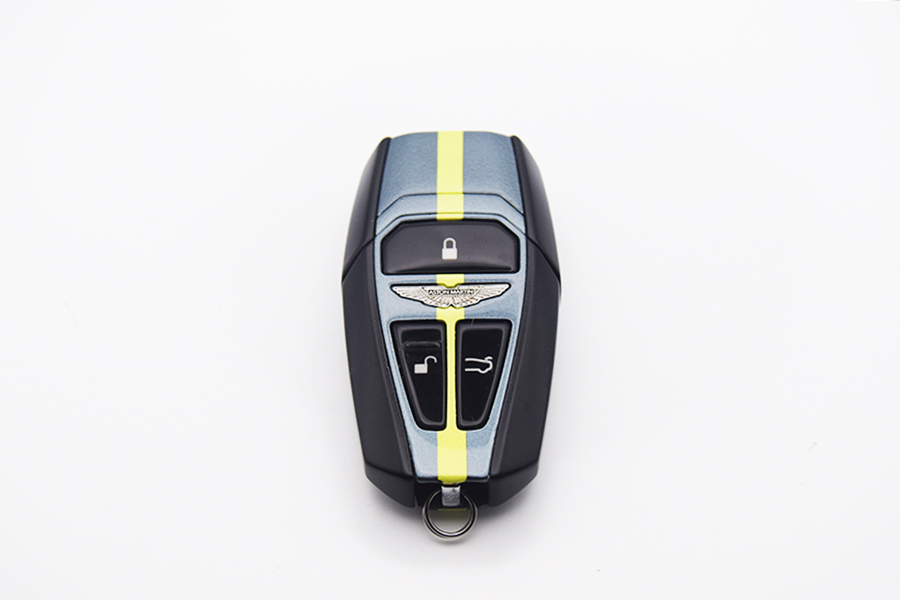After discussing options it was settled the key would be finished in Sea Storm with Lime Essence AMR Stripe with complementary Satin Black Sides to match the colour scheme of our customers Aston Martin.